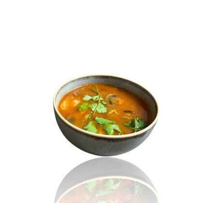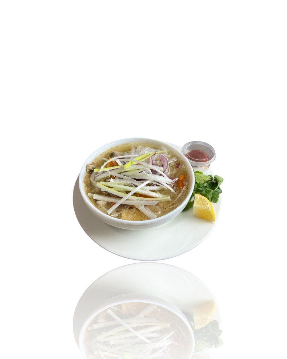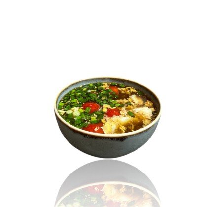 насыщенный говяжий бульон с телятиной и рисовой лапшой, ароматизированный корицей и имбирём. Вкус дополняют лук порей, красный и зелёный лук, а также грибы эноки и шампиньоны.