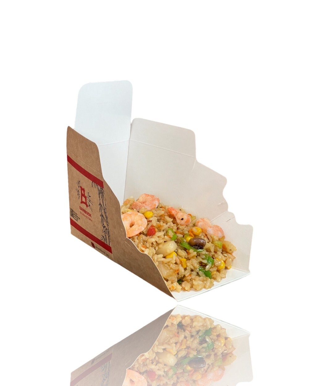 рис, обжаренный с коктейлем из морепродуктов и овощами: кукурузой, морковью, болгарским перцем, сельдереем и луком.