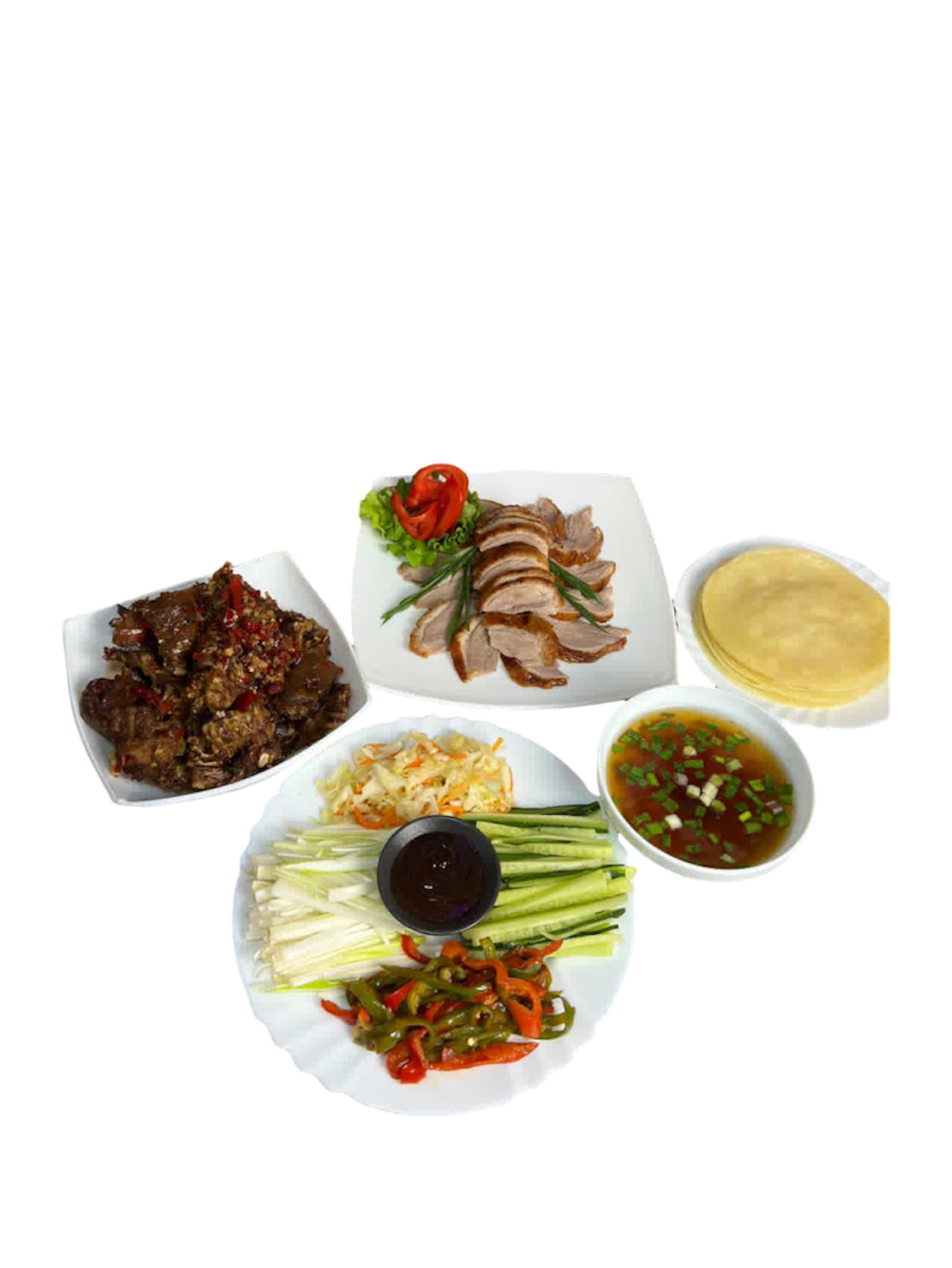 Утка с тонкой хрустящей корочкой подается с пшеничными блинчиками и ароматным сливовым соусом.