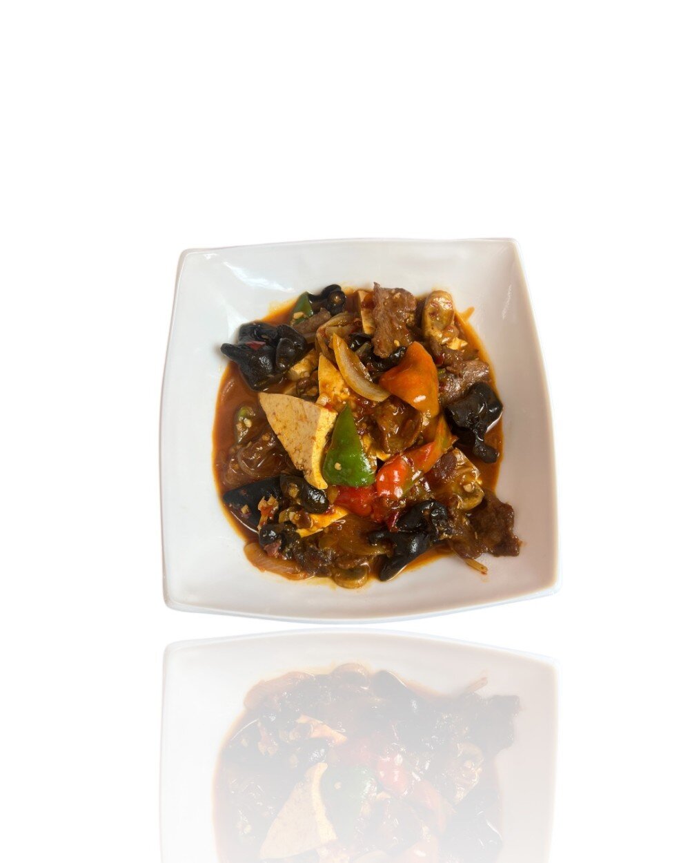 Мягкий тофу и нежная телятина прекрасно сочетаются с хрустящим полуострым перцем и древесными грибами муэр.