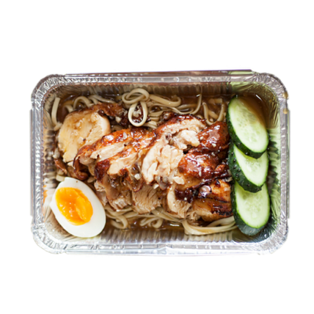 Курица на пару ,лапша,фирменный соус,огурцы,отварное яйцо