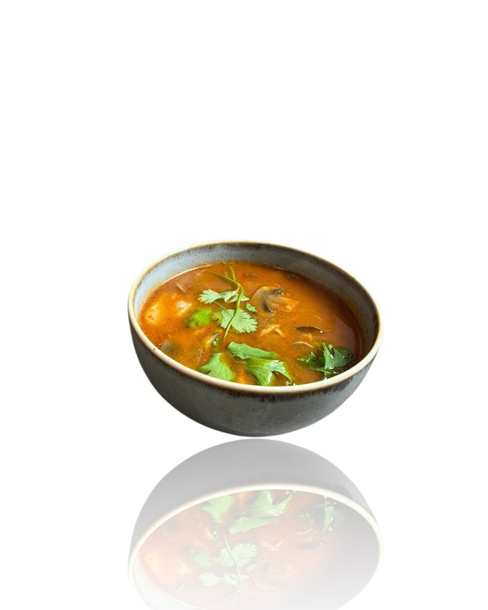Ароматная паста Том Ям с морепродуктами, шампиньонами и свежим лемонграссом.