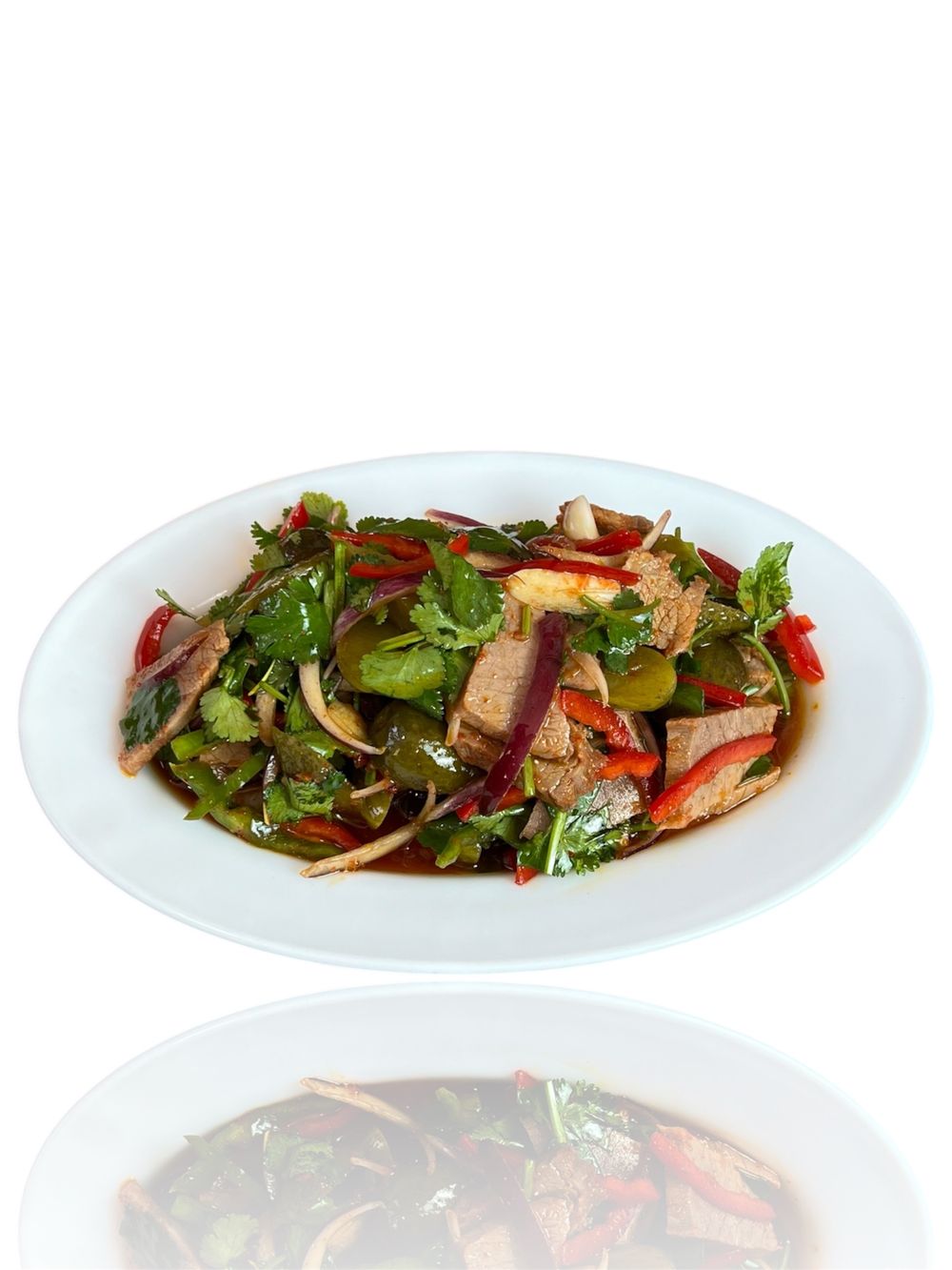Пикантный салат с сочной говядиной, свежими овощами (огурцы, болгарский перец, красный лук), зеленью и ароматной заправкой в азиатском стиле.