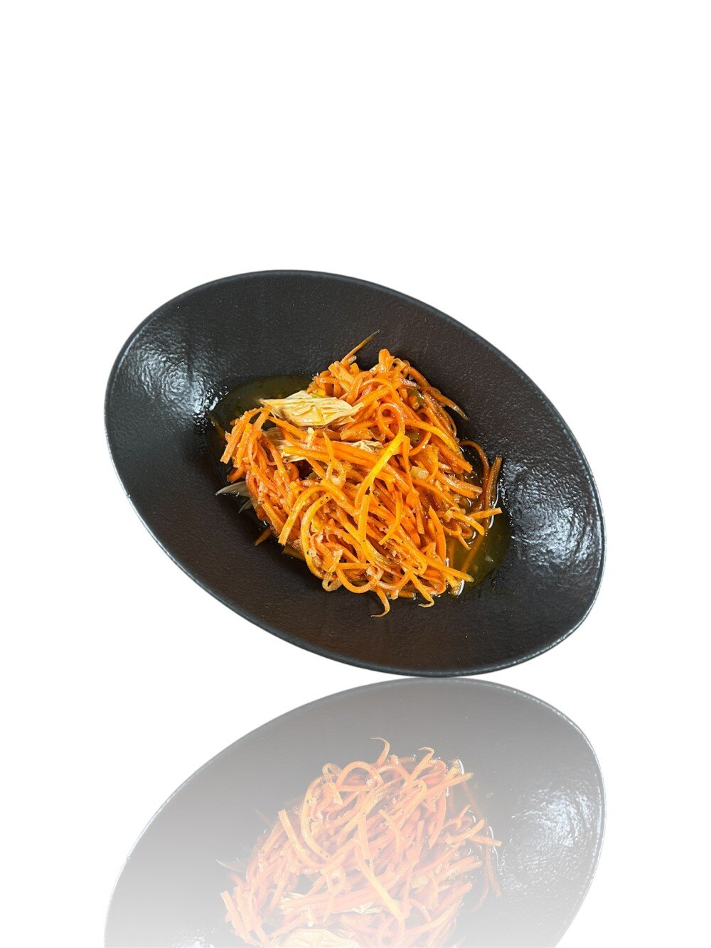 Хрустящая морковь, нарезанная соломкой, в остром чесночном соусе со спаржей — бодрит и разжигает аппетит.
